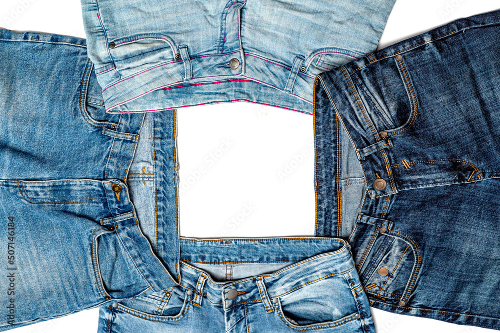 Various blue jeans pants or trousers made of blue-colored denim cloth. Closeup abstract texture cotton fabric for background design. Pair of jeans, pockets, rivets, buttons, seams