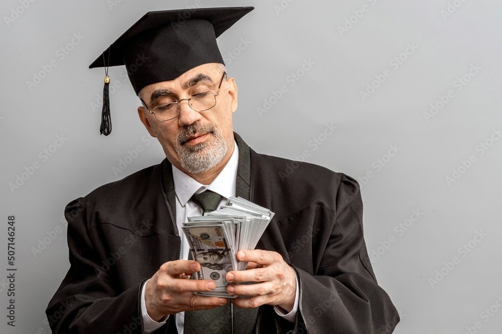 Academician, Professor with cash bill dollars. Prof is wearing a cap with Tassel and black gown. Concept of cost of education or bribe in university or college. Senior Educator, Doctor of Philosophy