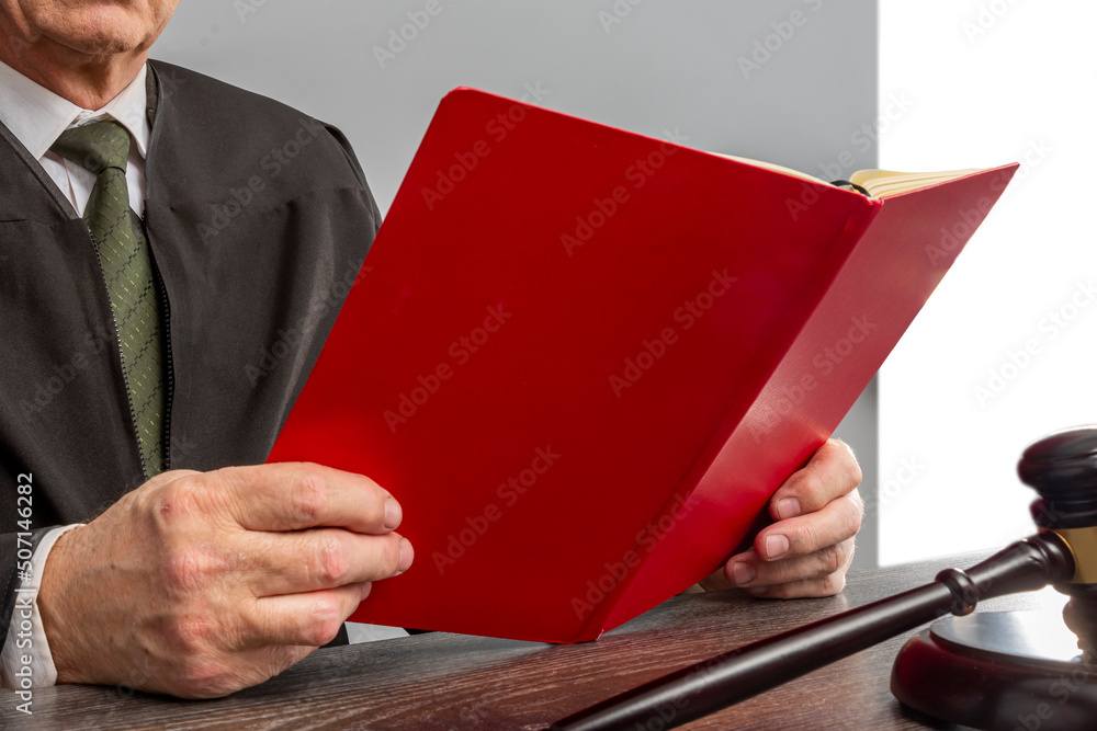 Judge reading the verdict. Judge's gavel on the table in the courtroom. Law Lord wearing gown using a hammer for attention, justice judgment at courts of law