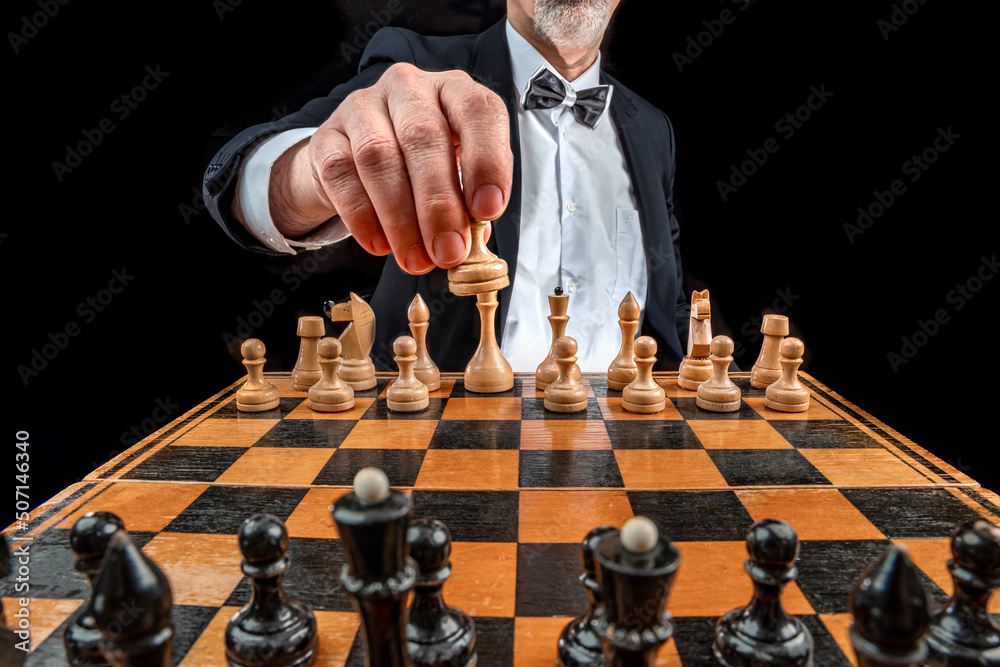 Chess Grandmaster, chess player. Мan in an elegant formal suit playing chess at a chess tournament. Old-fashioned chess pieces on a retro chessboard