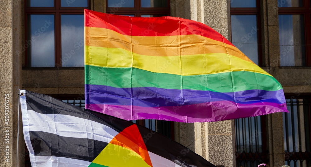 Waving rainbow flag, symbol of LGBT love during Pride Parade. Equality march in Krakow, Poland to support and celebrate LGBT+, LGBTQ gay and lesbian community.