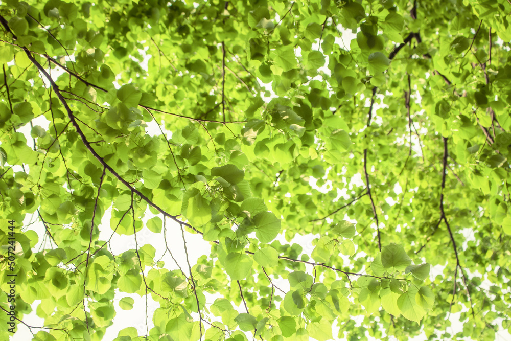 Beautiful green foliage background in summer. Green leaves view against the sky.