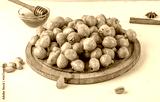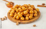 Traditional sweet luqaimat or lokma drizzled with honey syrup on a wooden board on a light background.