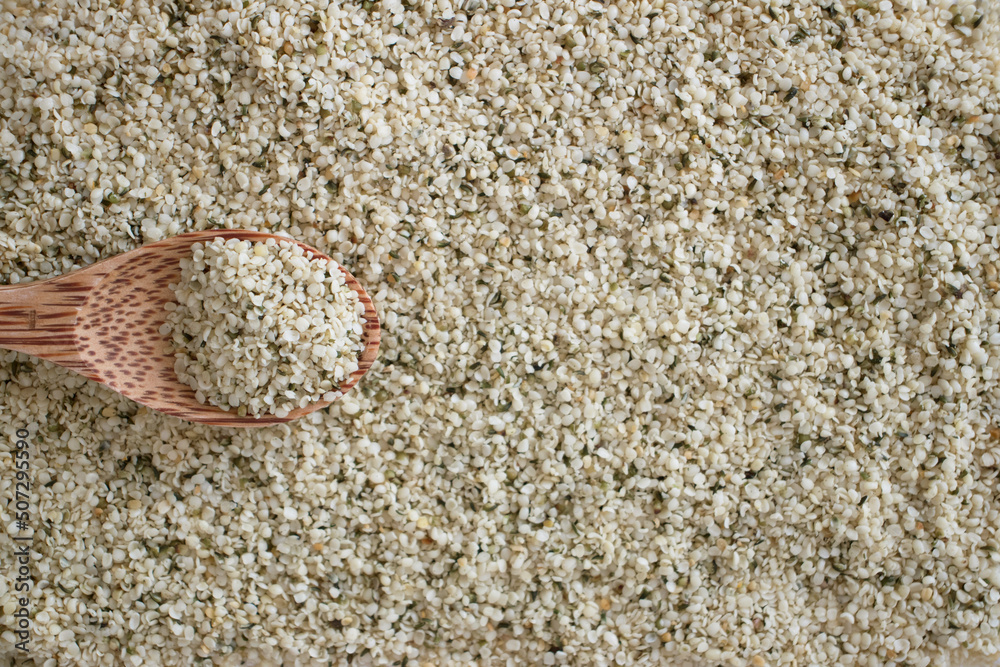 Hemp seeds in a wooden spoon on a background of seeds, top view with copy space