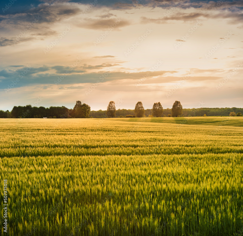 Beautiful landscape at sunset of spikelets and there are trees on the horizon.