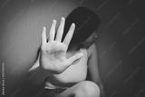 Closeup image of a woman outstretched hand and showing stop hand sign