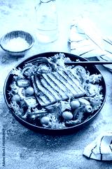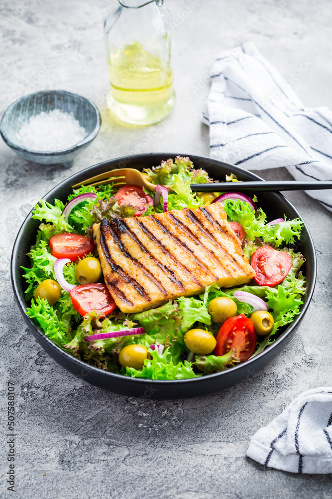 Fresh salad with grilled cheese, tomatoes and olives