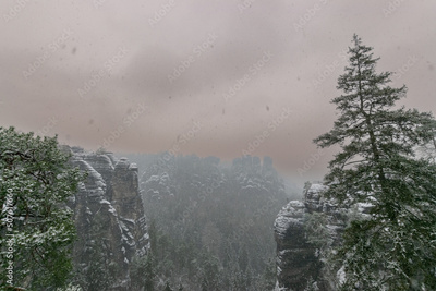 snowy landscape of the Elbsandsteingebirge with bastion bridge (Saxon Switzerland, Germany)