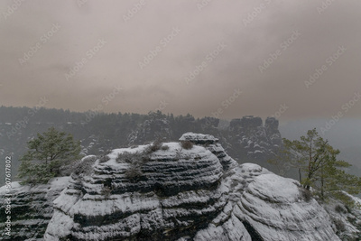 snowy landscape of the Elbsandsteingebirge with bastion bridge (Saxon Switzerland, Germany)