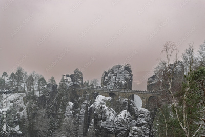 snowy landscape of the Elbsandsteingebirge with bastion bridge (Saxon Switzerland, Germany)
