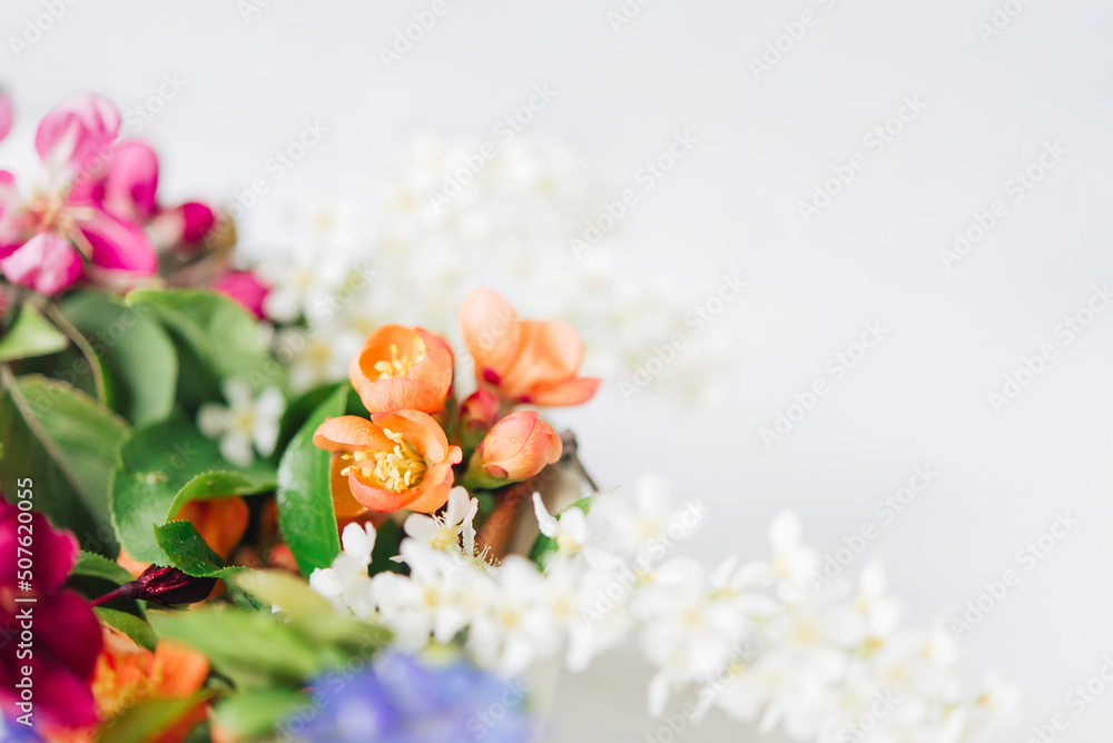 Spring blooming delicate flowers in a round vase on a table with a white tablecloth, a pastel bouquet and a delicate floral card