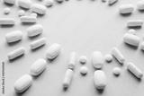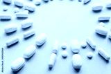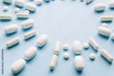 White pills on a pastel blue background. Capsules and round pills close-up. health care and medicine.