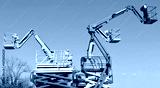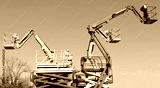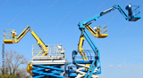 Group of work aerial platforms, cherry pickers and scissor lifts models, against blue sky.