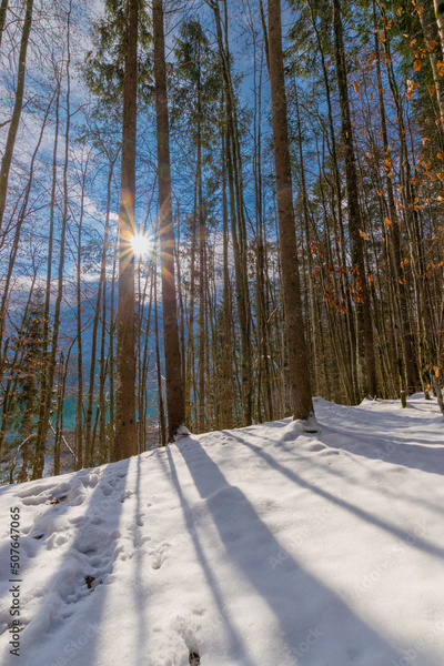 Deep blue lake in snowy forest (Bavaria, Germany)