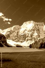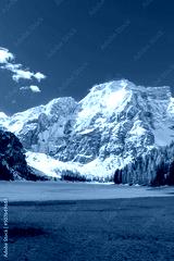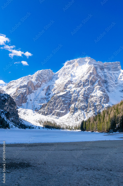frozen Lago di Braies and its mountain scenery (Dolomites, Italy)
