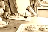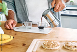 Man preparing classic Italian coffee in the mocha in the kitchen. Pouring coffee from moka pot into small glass coffee cup. Coffee brake. Morning habit.