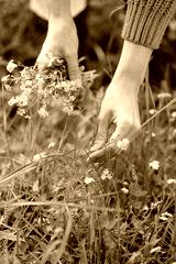 young woman plucks wild blue flowers in the green park on summer sunny day. girl with curly hair in dress makes bouquet of beautiful flowers. vertical photo