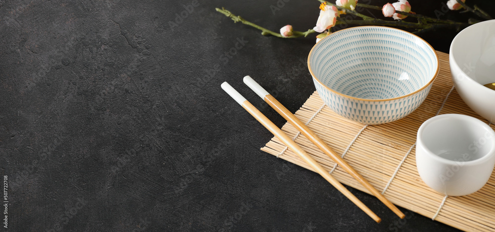 Chinese bowls with chopsticks and bamboo mat on dark background with space for text