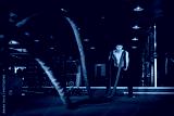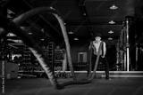 Fitness muscular man working out training with rope in functional training fitness gym is CrossFit exercise concept.