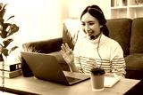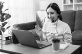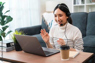 Woman consultant wearing microphone headset of customer support phone operator at home office.