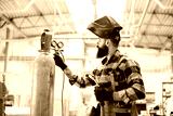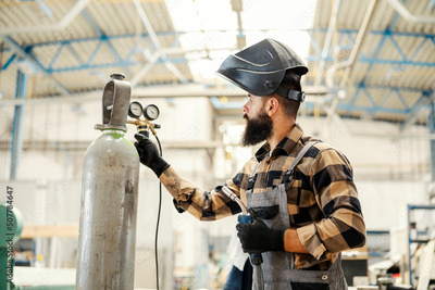 A heavy industry worker preparing welder for welding and unscrew the valve in factory.