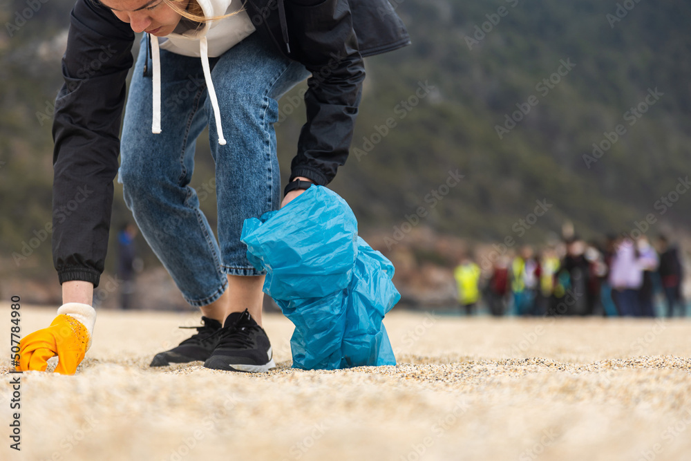 A woman in gloves with a special blue bag picks up garbage among the sand along the coast. The problem of environmental pollution. Cleaning up trash on the beach