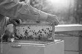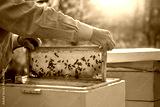 Beekeeper removing honeycomb from beehive. Person in beekeeper suit taking honey from hive. Farmer wearing bee suit working with honeycomb in apiary. Apiary as a hobby. Organic farming. Copy-space