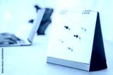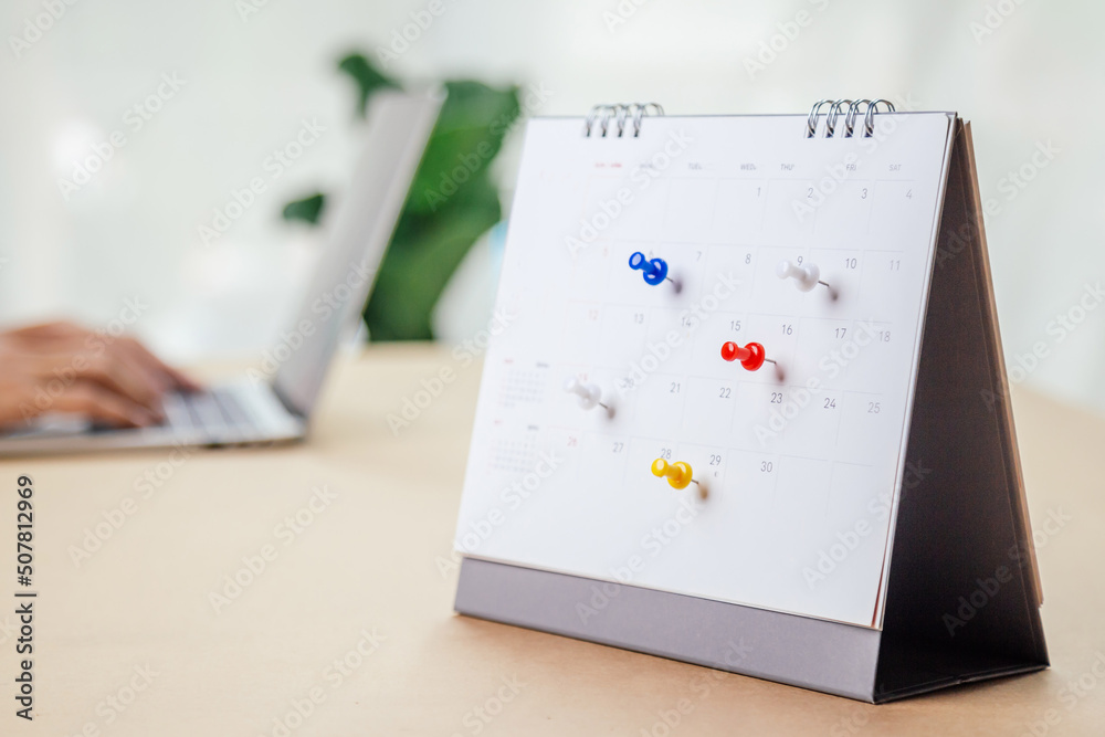 Calendar desk place on the table. Desktop Calender for Planner to plan agenda, timetable, appointment, organization, management each date, month, and year on wooden office table. Calendar Concept.