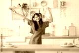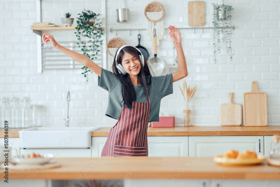 Happy carefree asian woman wearing headphones have fun moving listening to music relax in kitchen, She dance enjoy leisure weekend at home.