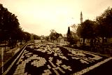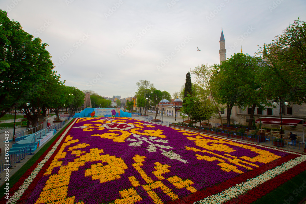 Blue Mosque, (Sultanahmet Mosque) and Hagia Sophia , tulips, Istanbul, Turkey.