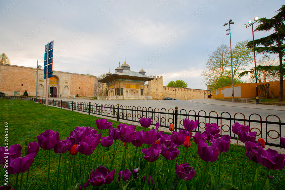 Blue Mosque, (Sultanahmet Mosque) and Hagia Sophia , tulips, Istanbul, Turkey.
