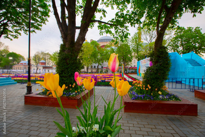 Blue Mosque, (Sultanahmet Mosque) and Hagia Sophia , tulips, Istanbul, Turkey.