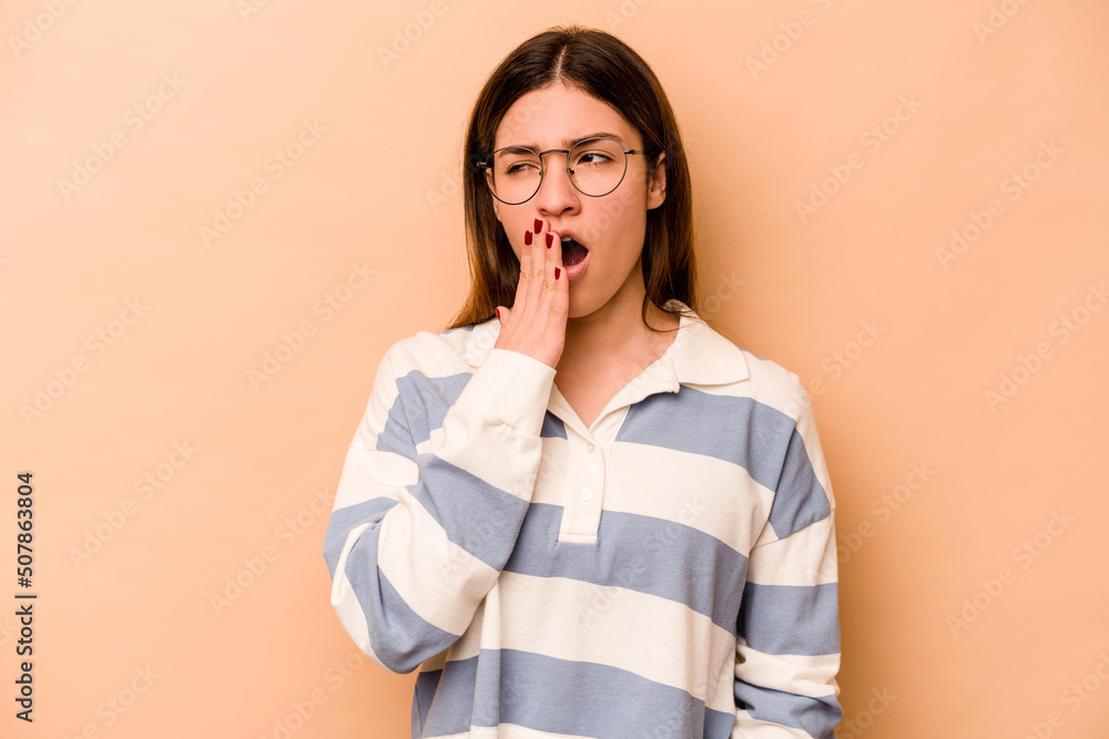 Young hispanic woman isolated on beige background yawning showing a tired gesture covering mouth with hand.