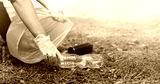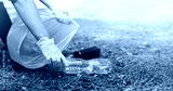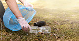 A woman hands in gloves collects and puts used plastic bottle into a blue trash bag. A volunteer cleans up the park on a sunny bright day. Clearing, pollution, ecology and plastic concept