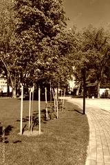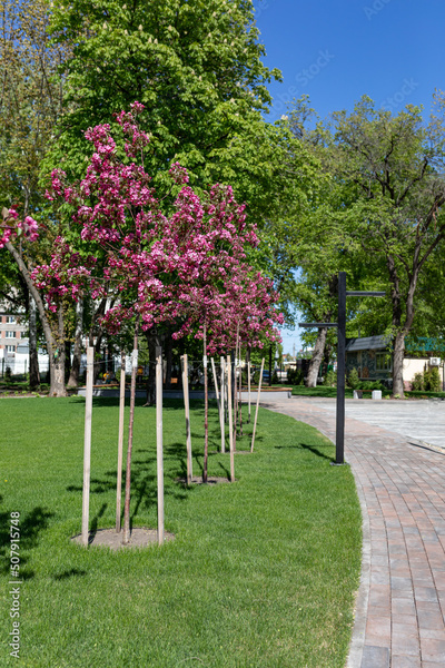 An alley with young flowering trees malus prunifolia. Landscaping, gardening of the city square.