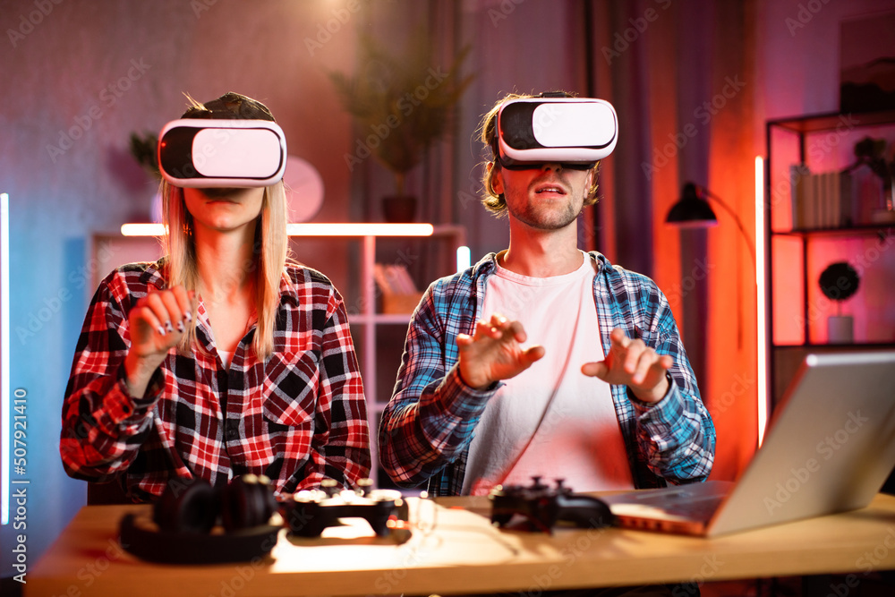Young attractive couple playing games in virtual reality goggles. Handsome man and pretty woman sitting at table and touching virtual screen with fingers. Modern entertainment and fun at home.