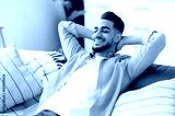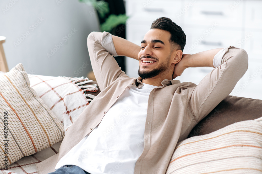 Close-up of relaxed happy indian or arabian guy with eyes closed, put hands behind head, sits in modern living room on comfortable sofa, enjoy calmness and alone at home in weekend, dreaming, smiles
