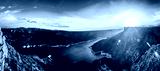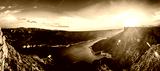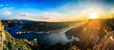 horizontal panoramic of lake at sunset with big monolith of the watchman in one side and the sun in another side in zimapan hidalgo