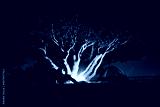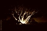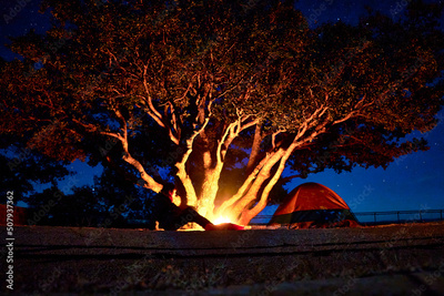man camping with bonfire and tree illuminated by orange light and dark sky in the background in guachochi chihuahua