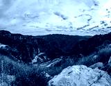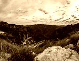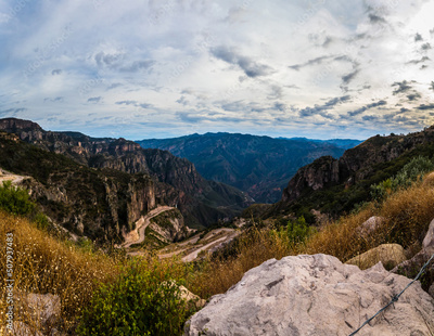 panoramic of beautiful canyon with cloudscape and mountains with rural way in guachochi chihuahua