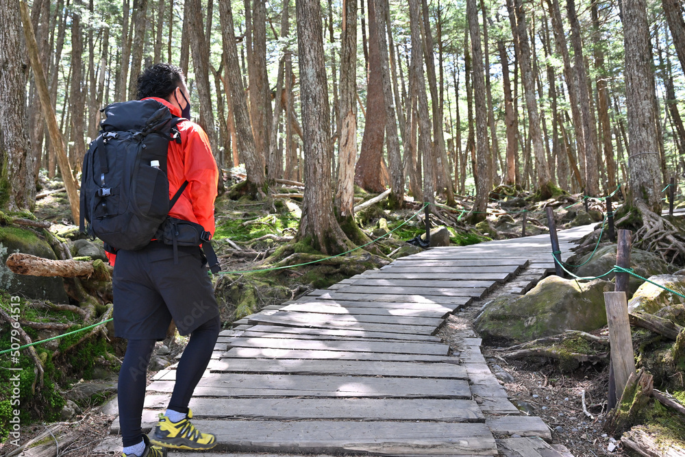 Back view of a man climbing a mountain