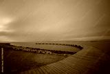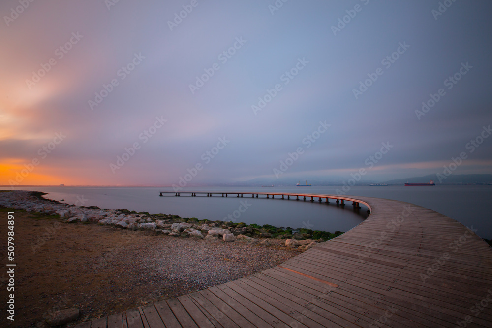 The pier like a boomerang at sunrise was captured with the long exposure technique.