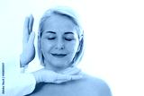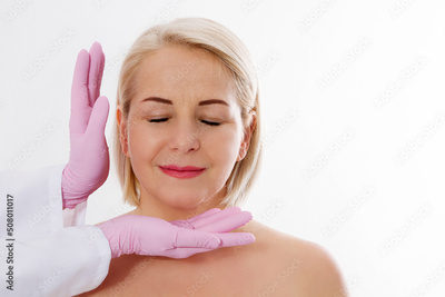 Beautiful Middle Age Woman before Plastic Surgery. Macro Face with Wrinkles and Doctor's Hands isolated on white Background. Anti Aging concept. Mock Up and Copy Space