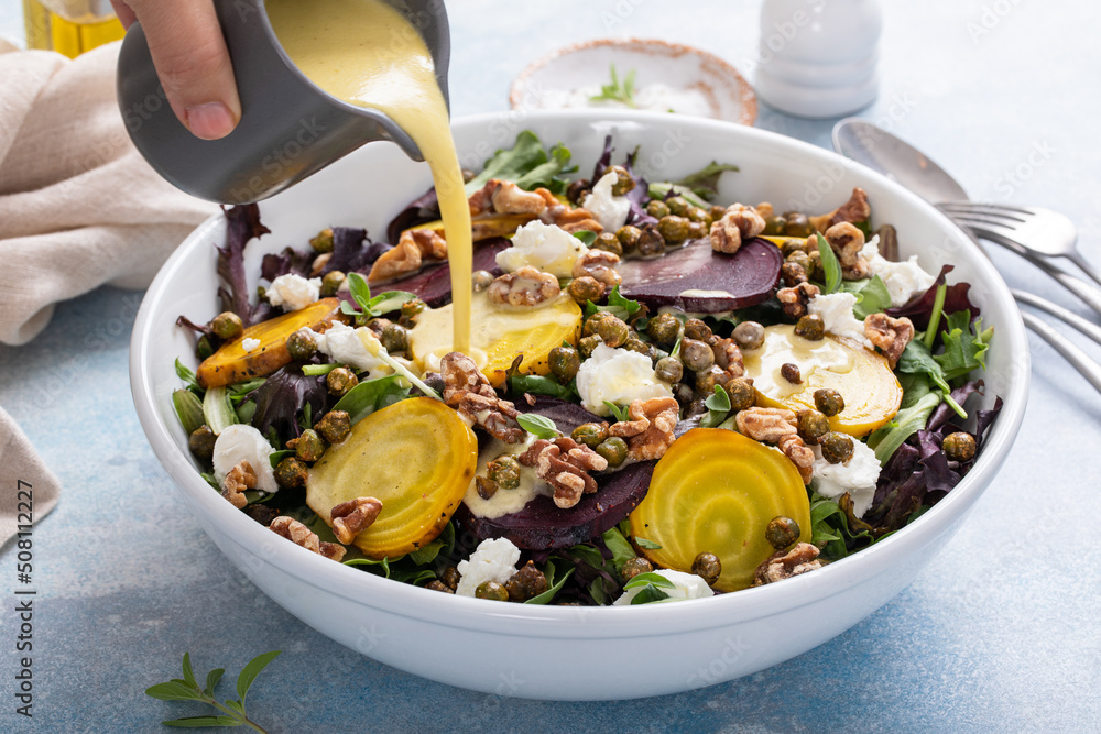 Beet salad with lemon dressing and roasted chickpeas