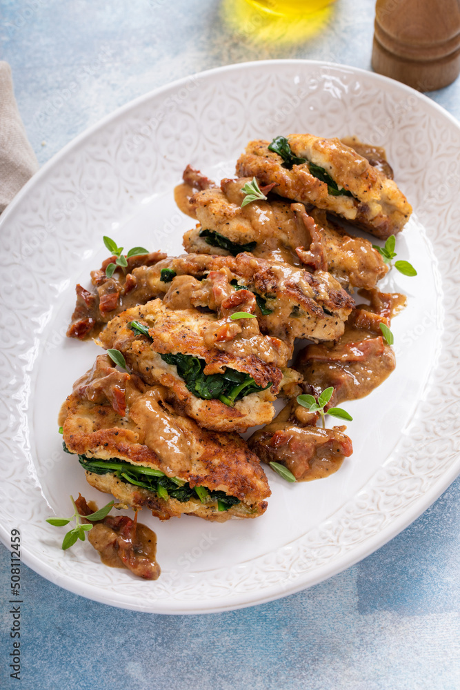 Chicken stuffed with spinach with dried tomato sauce