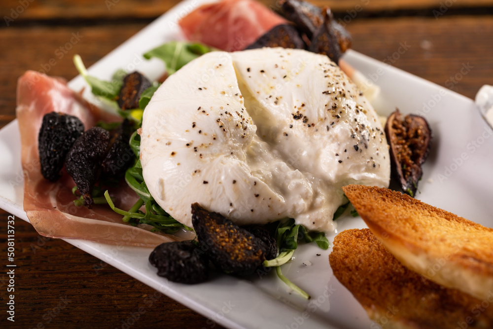 Burrata appetizer with prosciutto, dried figs and toasted bread