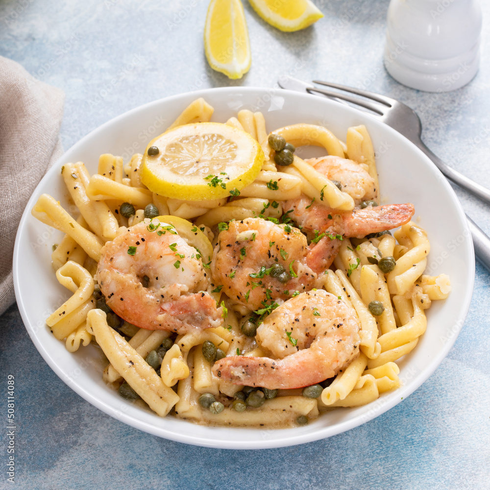 Lemon shrimp piccatta with penne, lemons and capers