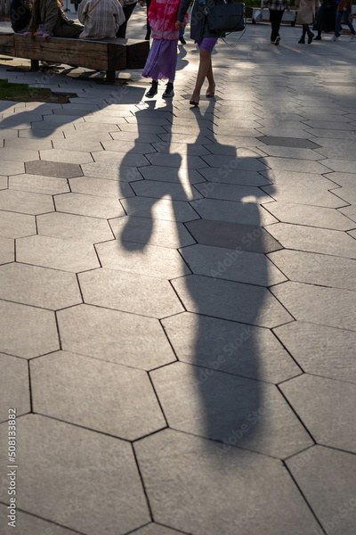 The feet of strolling pedestrians on the sidewalk paved with hexagonal large tiles. Human shadow on paving slabs at sunset