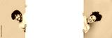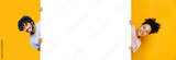 Two excited people, african american girl and indian or arabian guy, peeking out from blank white mockup banner, empty space for presentation, advertising, stand on isolated orange background, smile