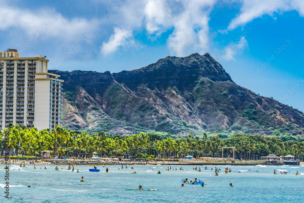 Colorful Waikiki Beach Surfers Swimmers Diamond Head Honolulu Hawaii